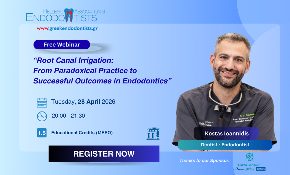 In our next webinar scheduled for Tuesday, December 17, 2024 at 20:00, Endodontist Vasilis Zioutis will present the topic: “Pulpitis: Secrets and strategies for an effective management”. This webinar is a collaboration of the Hellenic Association of Endodontists and the Dental Association of Lesvos. Attendees will be credited 1,5 CE credits (MEEO) as well as 1,5 CPD credits. The language of the webinar will be Greek.